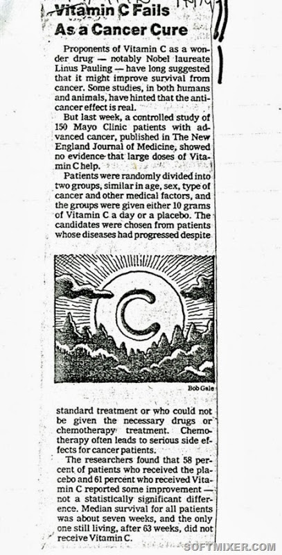 Получив удар в незащищенное место, ученые решили подвергнуть испытанию теорию Полинга. Чарльз Мертель (Charles Moertel) из Клиники Майо (Mayo Clinic) провел исследование 150 больных раком: половина из них получали десять граммов витамина C в день, тогда как остальные не принимали его. Пациенты, принимавшие витамин C, ничем не отличались по симптомам или по уровню смертности. «Мы не смогли показать терапевтические преимущества применения больших доз витамина C», — заявил Мертель.